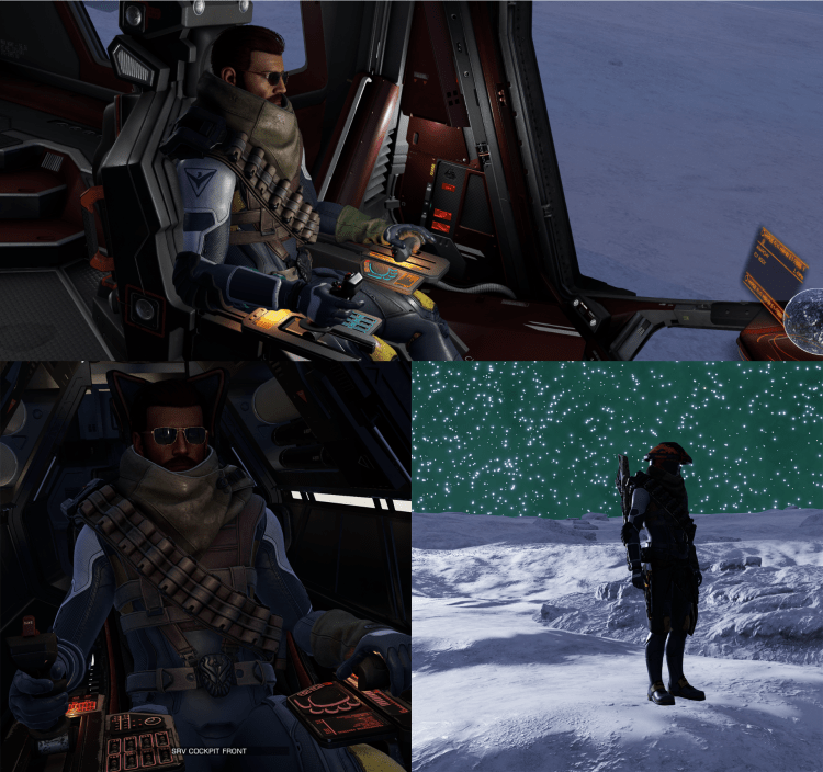 My face, left shoulder, arms, legs took some force in the impact when I descended from orbit. Nothing a stint in the med bay won’t fix, not that I can say the same for the Scarab SRV I ploughed through on my rendezvous with the ground.