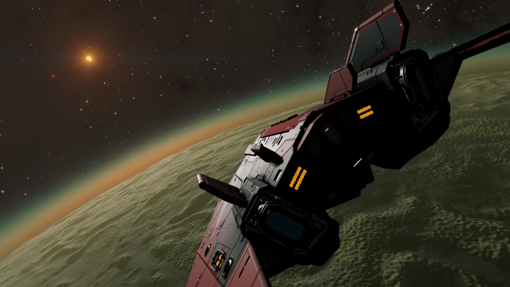 Picking out landmarks on the surface, I flicked the cockpit display to combat mode, only to clear the mapping overlay and get a better look at the atmospheric show and tell. The planet’s ammonia atmosphere was atmospheric to say the least, a blood red fading into dusty orange, then a light blue green as it seeped into the black of space.