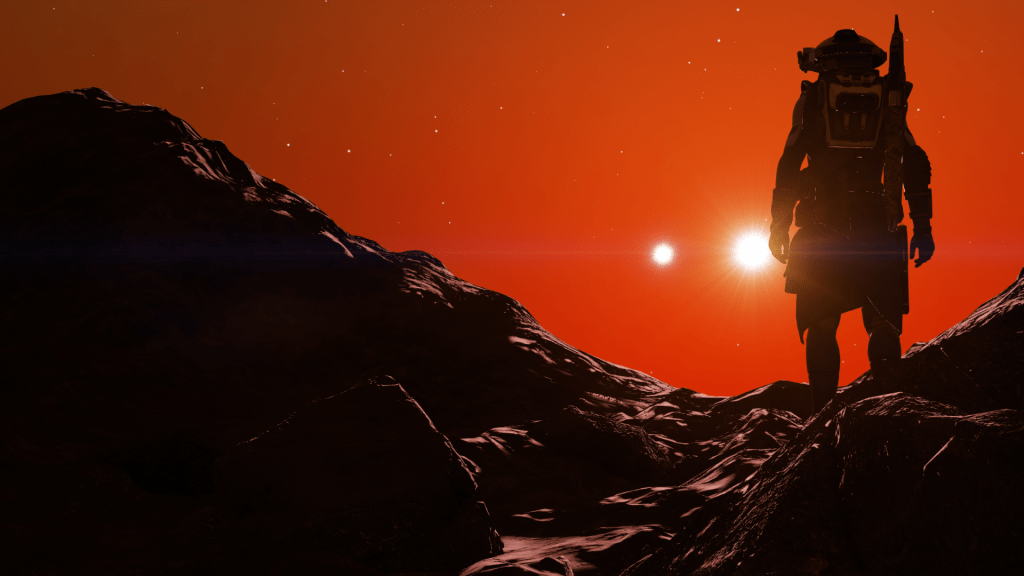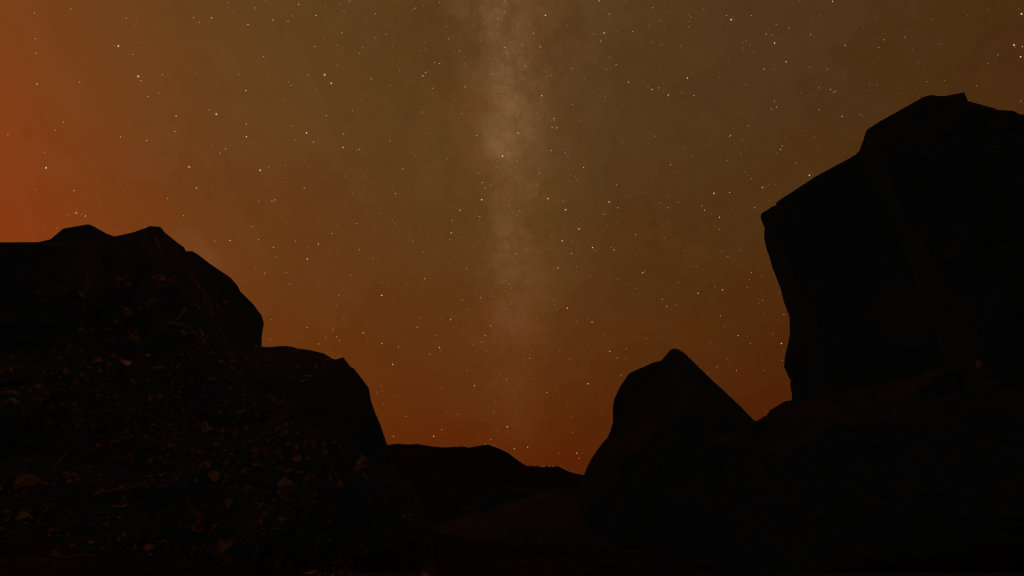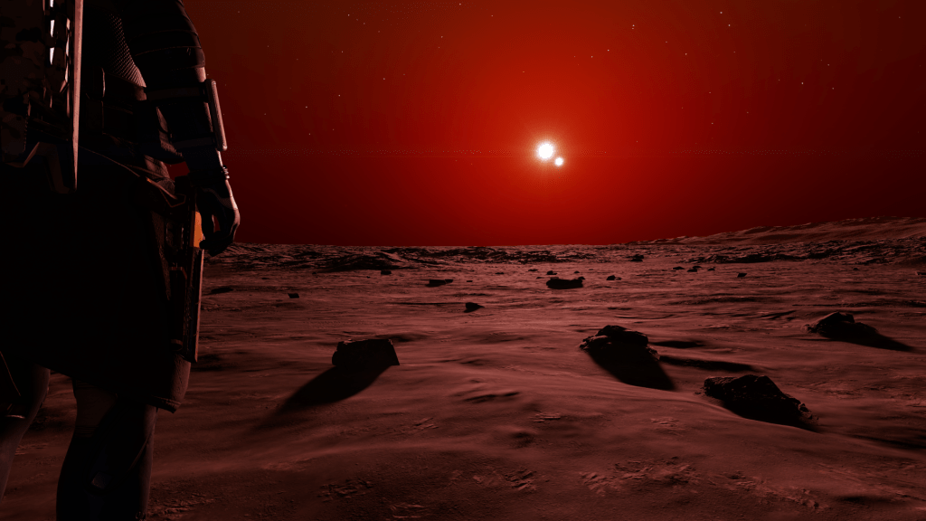 After several hours of bounding about in the SRV turning up no signs of other biologicals, I called it: this venture was a bust. I got out of the SRV and took one final moment in this confusingly calm but evil looking place. Grateful I had not fallen into that chasm, nor been eaten by horrific nightmare creatures, I watched the binary stars locked in their courtship, dance across the sky.