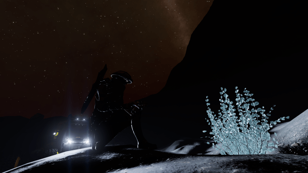 From a hollow near the top of the pass, I took some time to gaze at the galaxy core, the rocks around me silhouetted. Even with an overly eerie feeling, there was a pleasant calm about the place. Something caught my eye, in a shallow recess, slowly swaying in the mountain air current, Frutexa Metallicum. Excited, I darted over and started scanning the genetic make up, two more samples and that is biological one of four in the bag.