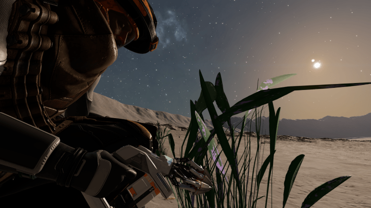 I dropped The Hiraeth just outside the south eastern edge of the crater. Surrounding the ship Frutexa fera, everywhere frolicking in the light of the system’s courting binary stars. Something in the air made me feel positive about this biological attempt. Although it could have been that bright blue sky, giving me a “Sun Shiny Day” notion that I just mistook for positivity.