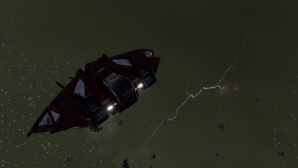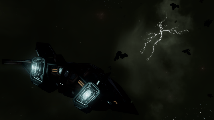 I clambered back into the crash couch and edged the ship forwards. It was dark out there, darker than normal, I mean space is DARK. As thunder roared around The Hiraeth, the blackness turned olive green with strings of lightning streaking past, mineral clusters silhouetted against the cloudy backdrop.