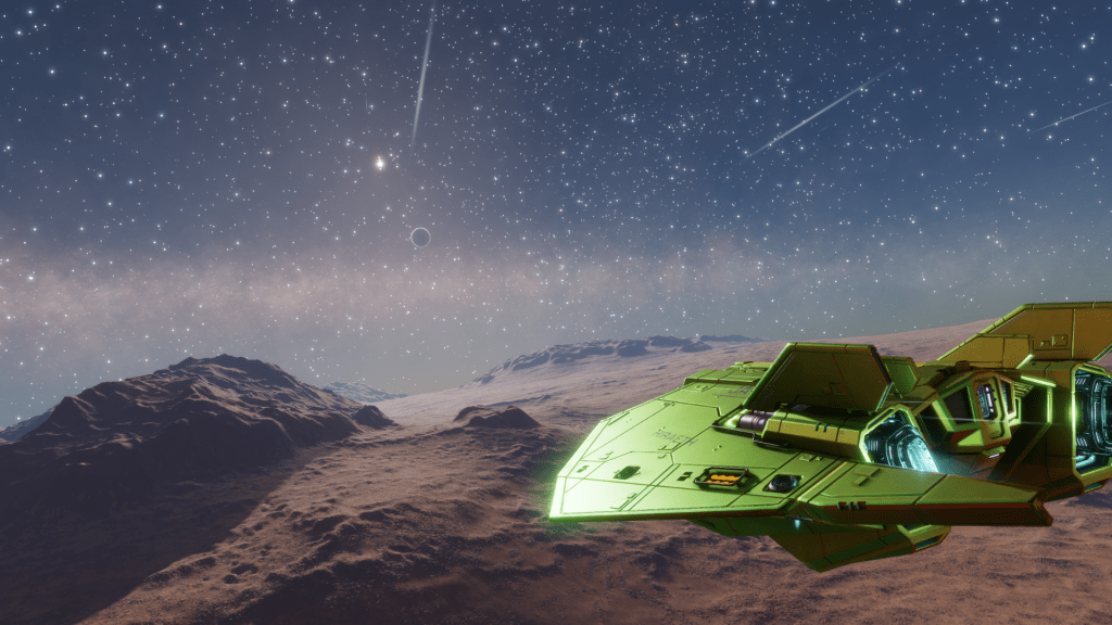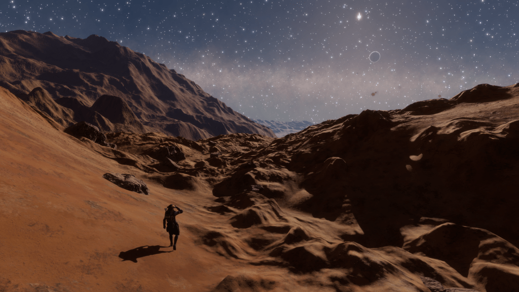 The sky was a nice shade of royal blue, peppered with white specs of light and the galactic core hanging low in the sky. The K class star shone bright, back lighting the planets parent gas giant. All I wanted was a nice body of water, a canvas chair and a fishing rod and this would have been a prime spot to build a rest and relaxation resort.