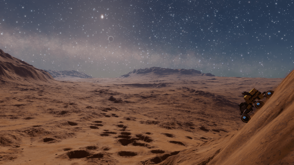 Drifting through the blue carbon dioxide atmosphere, domed mountains came into view protruding up from sandy earth. The body only possessed two biological life signs; bacterium and tussock grasses so this diversion would be primarily about getting some exercise.