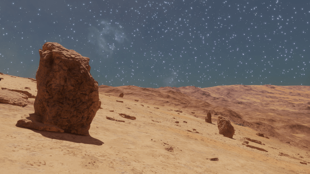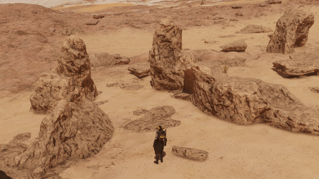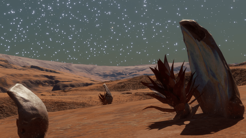 Pushing through the blue of the atmosphere, a rusty brown planet emerged with patches of golden sand and carbonised scorched patches. While initially keeping a watchful eye out for the Clypeus specimens, I had noticed strange eroded structures on the surface. These were mainly confined to monoliths. But then there it was on the earthen hillside, the remains of what looked like a gateway of sorts. I took the Hiraeth in for a closer look.