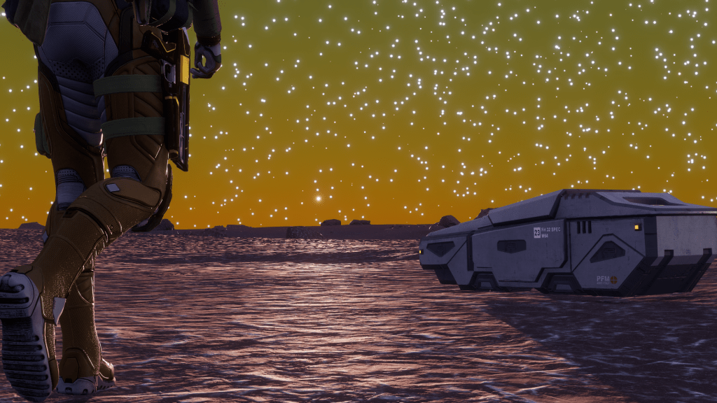 The crash site was rather flat save for a few hills, I had no issues getting the Hiraeth in close. Briefly examining some of the mechanical parts strewn around, it looked at first glance that these maybe easy to salvage using my plasma cutter. I couldn’t see anything that looked to be concealing a transmitter or any computer equipment, I was hoping to download some log files and get some information on the wreck.