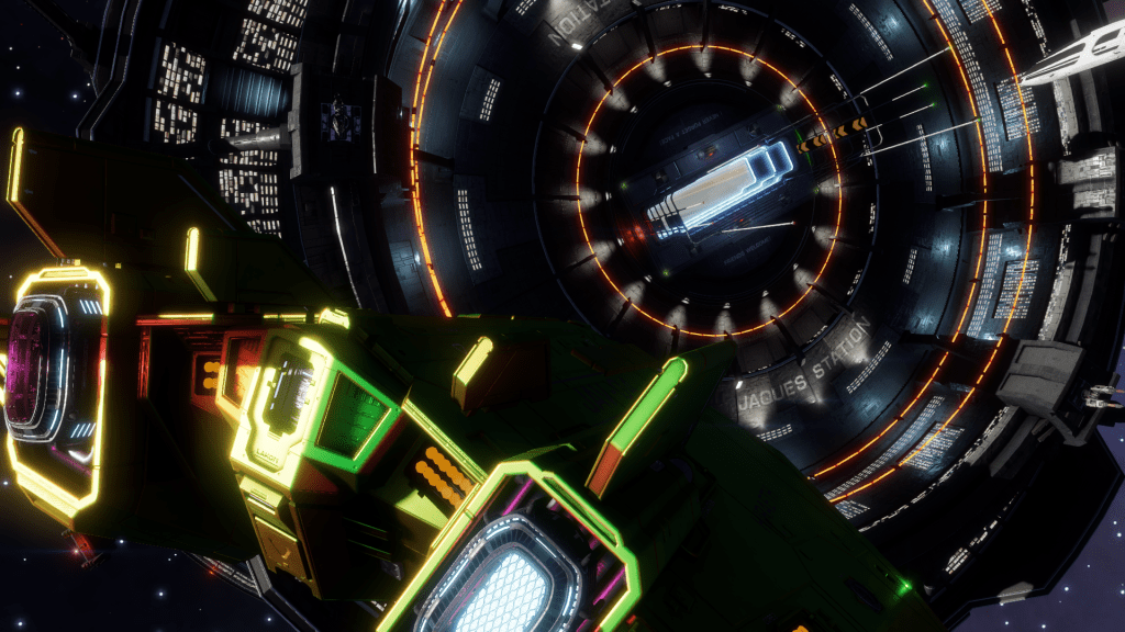 We made Jaques Station in good time, limping through the mail slot the distinct warble of the proximity warnings rang around the cabin. Throttling down and switching over to the manoeuvring thrusters I steered the Hiraeth to the assigned landing pad. As the landing gear gave a satisfying crunch, I threw my head back against the crash couch and let out a deep sigh of relief, time to order up hull and module repairs, that Viper had really done a number on me before I had managed to escape.